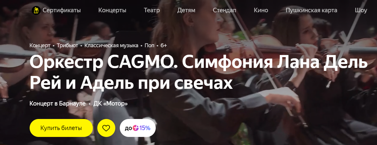 Симфонический оркестр CAGMO выступит 7 февраля в ДК «Мотор». Программа «Симфония Лана Дель Рей и Адель» включает хиты обеих певиц, исполняемые при свечах. В первом отделении прозвучат композиции Ланы Дель Рей, такие как «Summertime Sadness» и «Young And Beautiful». Во втором — песни Адель, среди которых «Rolling In The Deep» и «Set Fire to the Rain». Начало концерта в 19:00. Цена билетов составляет от 1900 до 5700 рублей.