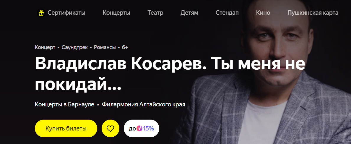 Алтайская краевая филармония 7 и 8 февраля приглашает на концерт баритона Владислава Косарева. В программе «Ты меня не покидай…» артист исполнит песни из советских фильмов: «Белое солнце пустыни», «Ирония судьбы, или С лёгким паром!», «Д’Артаньян и три мушкетёра» и других. Начало в 17:00. Билеты стоят от 1500 до 2000 рублей.