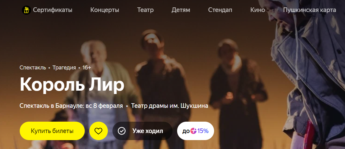8 февраля в театре драмы имени Шукшина состоится показ спектакля «Король Лир» по трагедии Шекспира. Начало в 17:30. Билеты можно приобрести за 300-900 рублей.