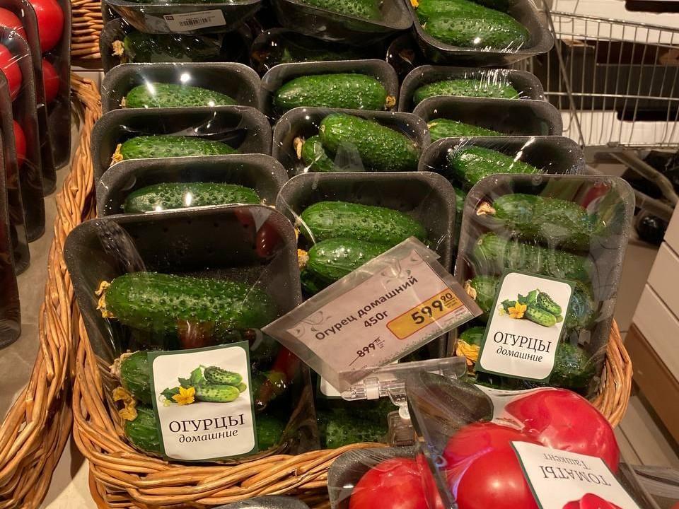 - В «Бахетле» 450 грамм домашних огурцов с пупырышками продают за 599 рублей (со скидкой, без неё — 899 рублей). Классические тепличные огурцы здесь стоят 399 рублей за килограмм.