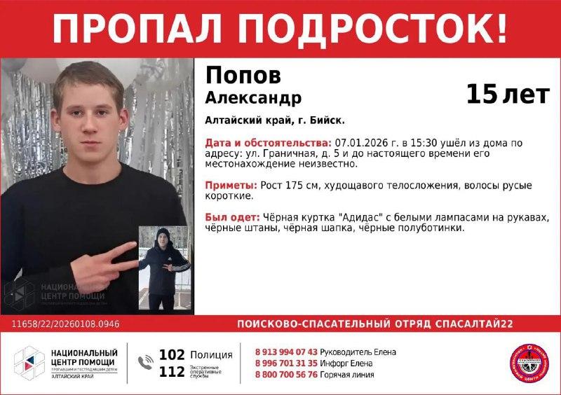 В Алтайском крае волонтёры поискового отряда «СпасАлтай22» и полиция проводят поисковые мероприятия в связи с исчезновением 15-летнего Александра Попова.