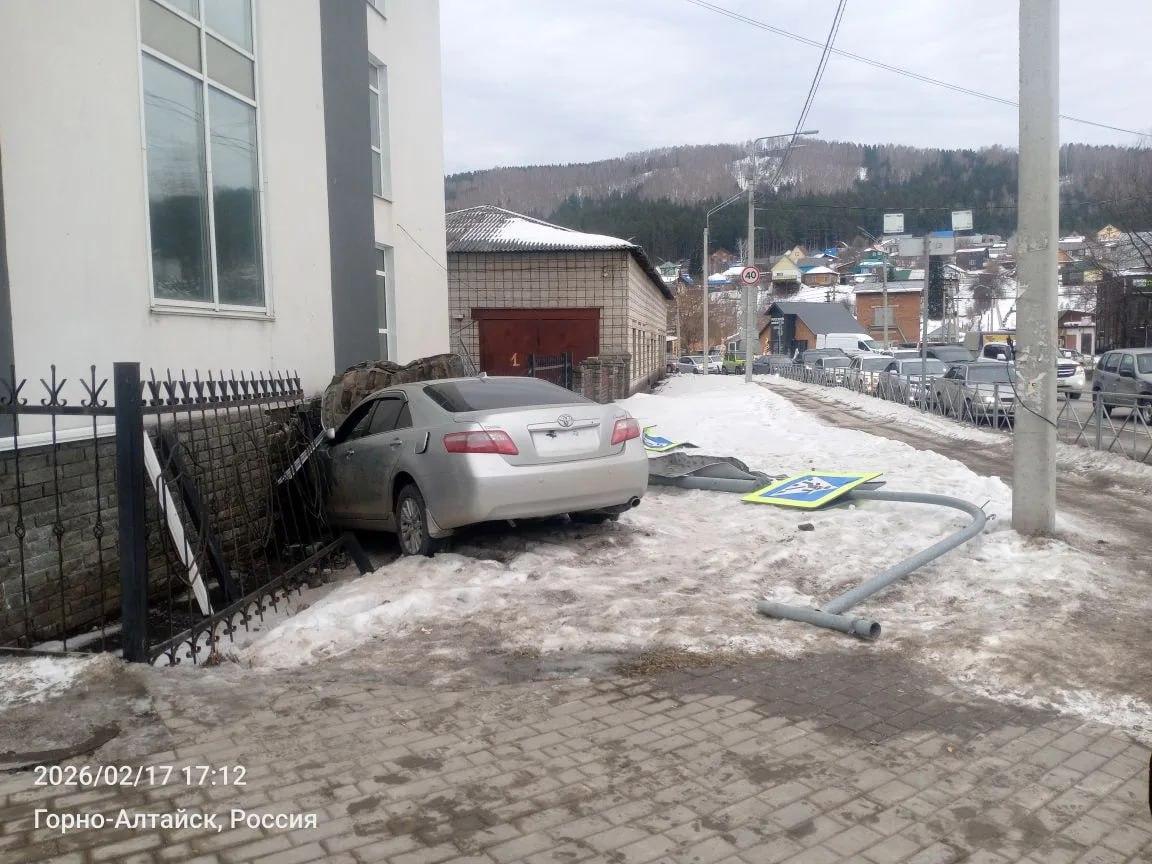 Действия мужчины создали помеху для движения. Чтобы избежать столкновения, автомобилистка свернула, съехала с проезжей части, снесла дорожный знак и врезалась в фасад здания Следственного комитета Республики Алтай.