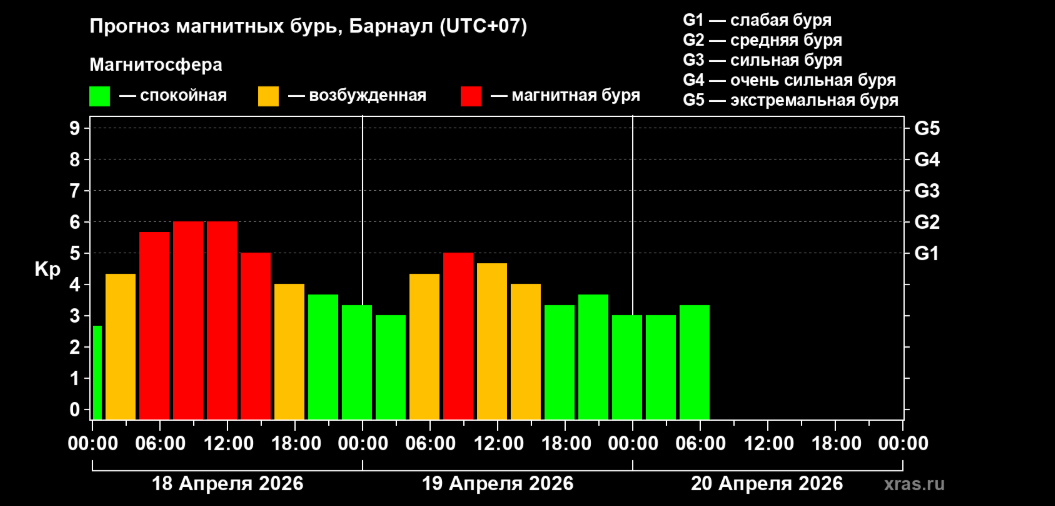 18 апреля Алтайский край оказался в зоне влияния магнитной бури средней силы. Согласно данным Лаборатории солнечной астрономии ИКИ РАН и Института солнечно-земной физики, геомагнитным возмущениям присвоен уровень G2.