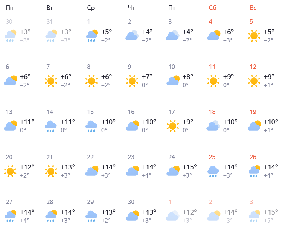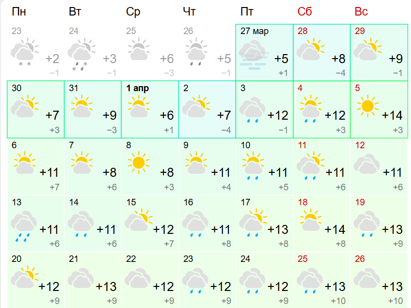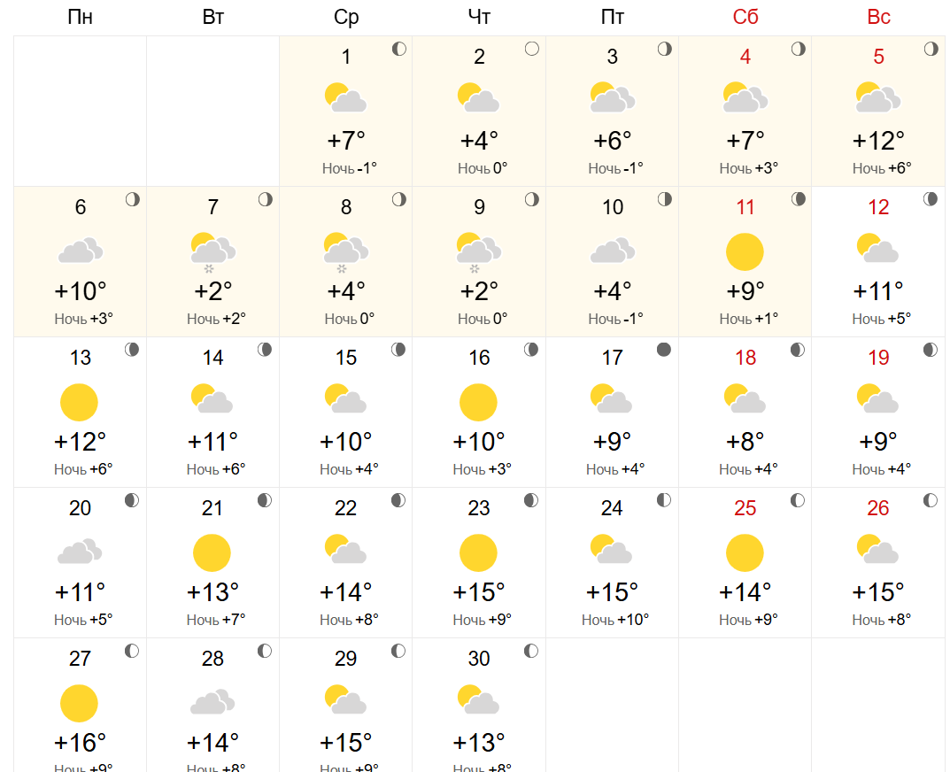 World-weather указывает схожие дневные показатели — от +2 до +16 градусов, а ночные — от -1 до +10. Отличием этого прогноза является указание на снежные осадки, которые возможны с 7 по 9 апреля.