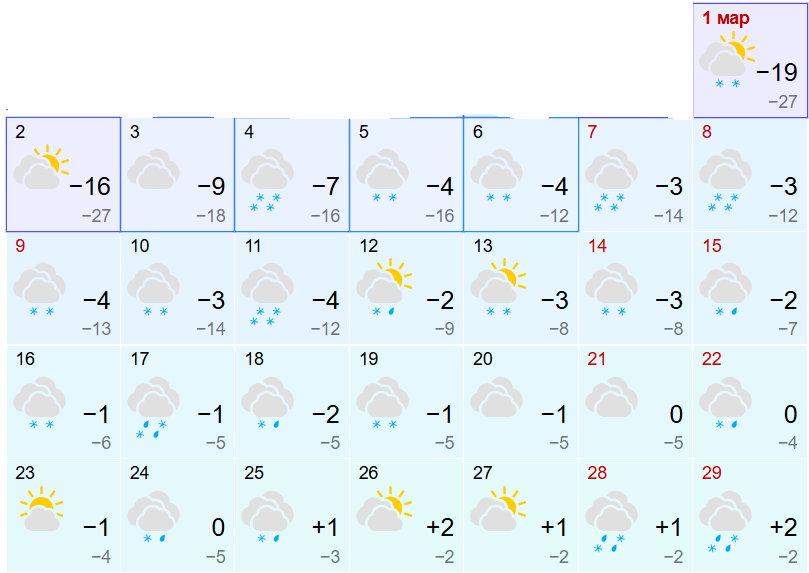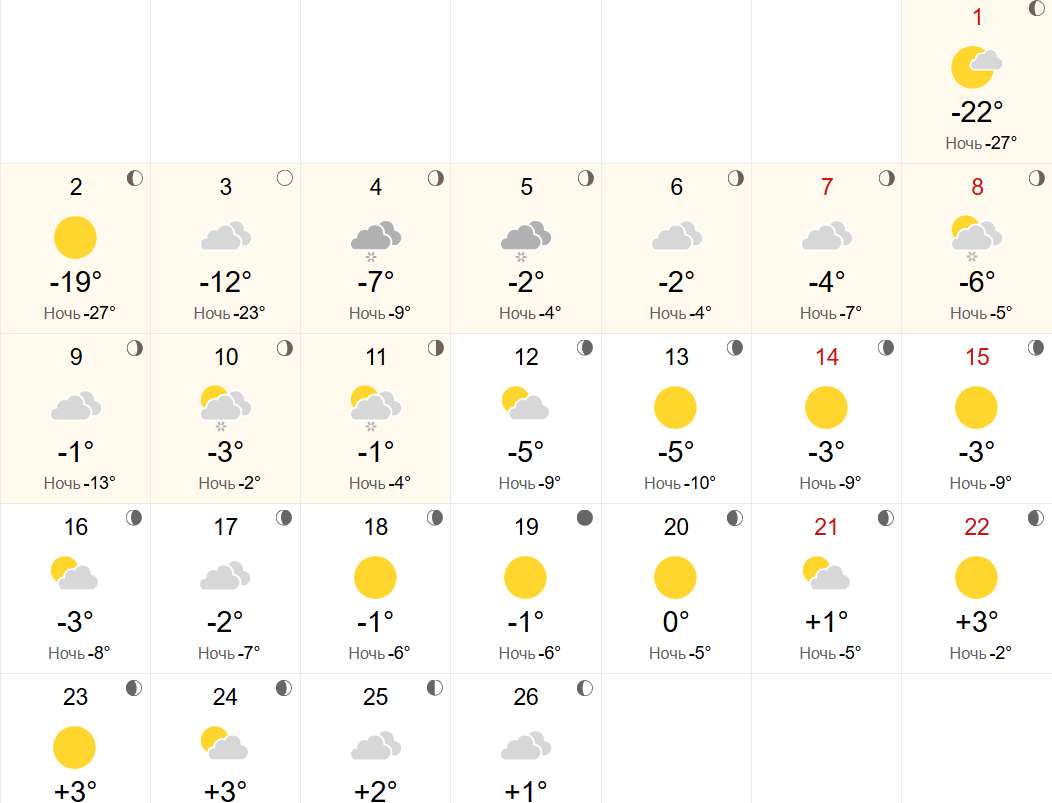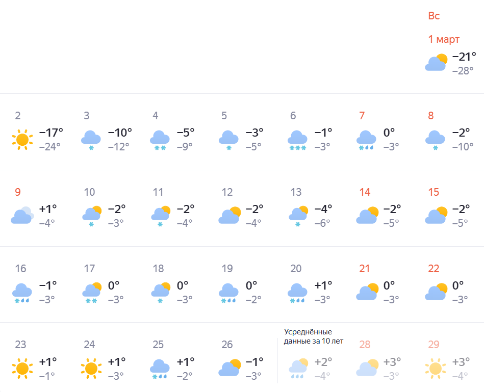 Яндекс Погода прогнозирует морозное начало месяца. 1 марта днем столбик термометра покажет -21 градус, ночью — до -28 градусов. Однако уже к 5 марта ситуация изменится: днем потеплеет до -3 градусов, ночью — до -5 градусов.