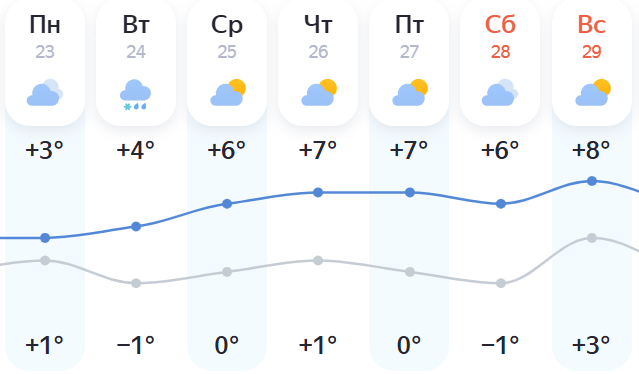 Прогноз «Яндекс Погоды» менее оптимистичен. Температура будет повышаться медленнее: в начале недели +3…+4 °C, а к воскресенью — +7…+8 °C. Мокрый снег с дождем возможен только 24 марта. В остальные дни прогнозируется ясная или облачная погода.