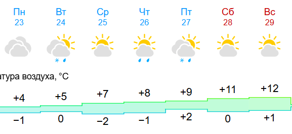 По данным Gismeteo, неделя начнется с температуры +4…+5 °C. Постепенное потепление приведет к тому, что к выходным воздух прогреется до +11…+12 °C. Ночные значения составят от -2 °C до +2 °C. Погода будет преимущественно пасмурной, а осадки в виде снега с дождем ожидаются 24, 26 и 27 марта.