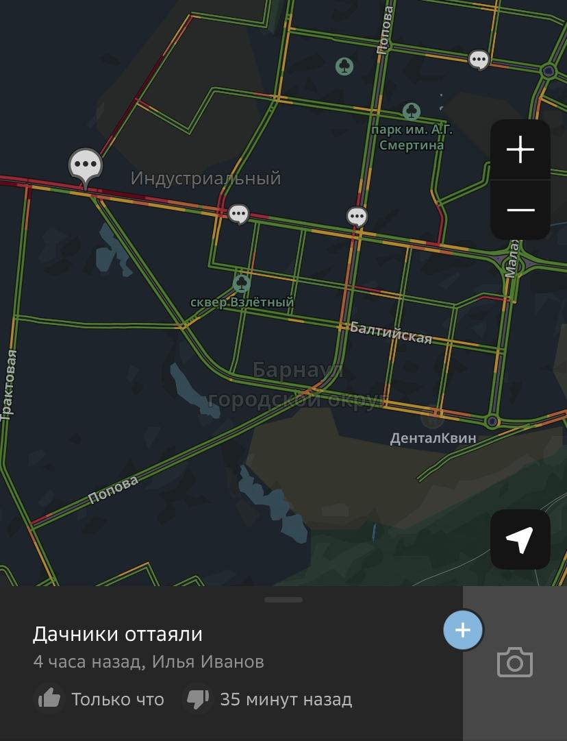 Днём 25 апреля в Барнауле образовались значительные заторы. Согласно данным сервисов «Яндекс карты» и «2ГИС», многие улицы окрасились в бордовые и красные цвета.