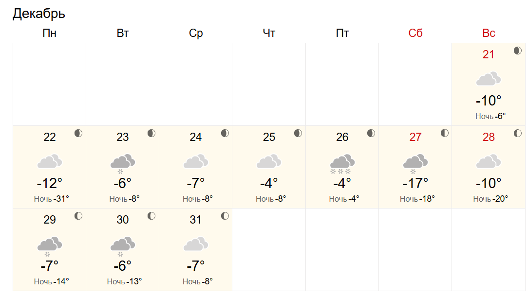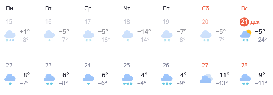 Прогноз Яндекс.Погоды не предвещает сильных морозов. В понедельник, 22 декабря, температура составит до -8°C. В остальные дни она будет держаться в пределах -4…-6°C. Ожидается облачная погода с обильными снегопадами. Ближе к концу недели, как и у других сервисов, прогнозируется усиление холода до -9…-11°C.