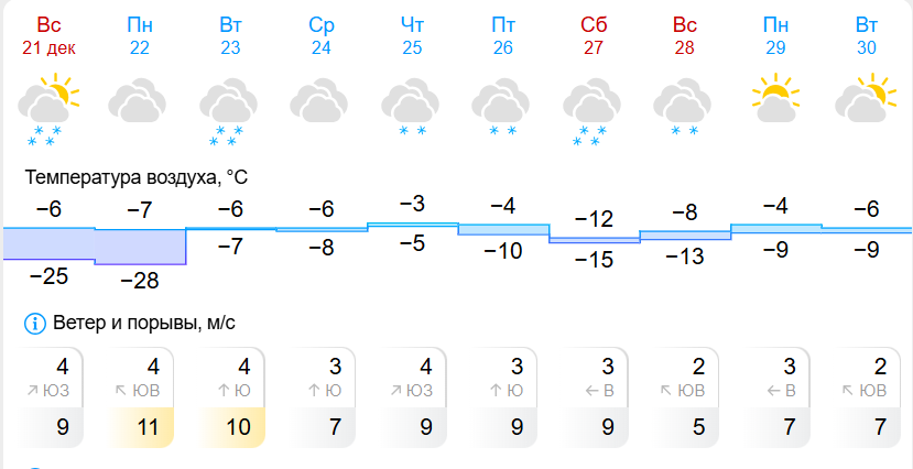 Согласно Gismeteo, начало недели будет морозным: днём около -7°C, а ночью до -28°C. Однако со вторника начнётся потепление, и температура поднимется до -6°C. Самый тёплый день ожидается в четверг, 25 декабря, когда прогнозируется всего -3°C. К выходным вновь последует похолодание до -8...-12°C. Снег, по словам синоптиков, будет идти почти ежедневно.