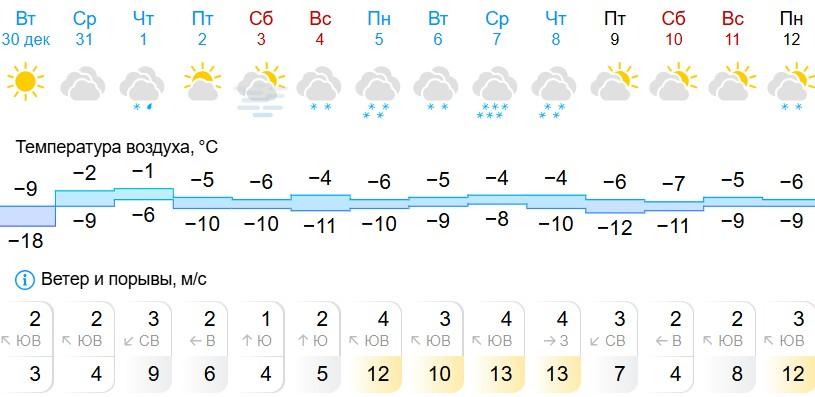 Согласно данным Gismeteo, 31 декабря и 1 января температура воздуха составит от -1 до -2 градусов. Ожидается снег, возможно мокрый, при слабом ветре 2-4 м/с. Первая неделя января также не принесет сильных морозов: средние температуры будут находиться в диапазоне от -4 до -6 градусов. Однако возможны снегопады и порывы ветра до 13 м/с. После 10 января прогнозируется похолодание до -7 градусов, которое сохранится до конца каникул.