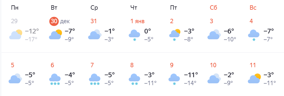 Яндекс.Погода прогнозирует, что 1 января температура может подняться до 0 градусов. В остальные праздничные дни будет прохладно, но без экстремальных морозов, с температурами от -3 до -7 градусов. Небольшое похолодание до -11 градусов ожидается 9 января, после чего погода станет мягче с температурой около -2 градусов.