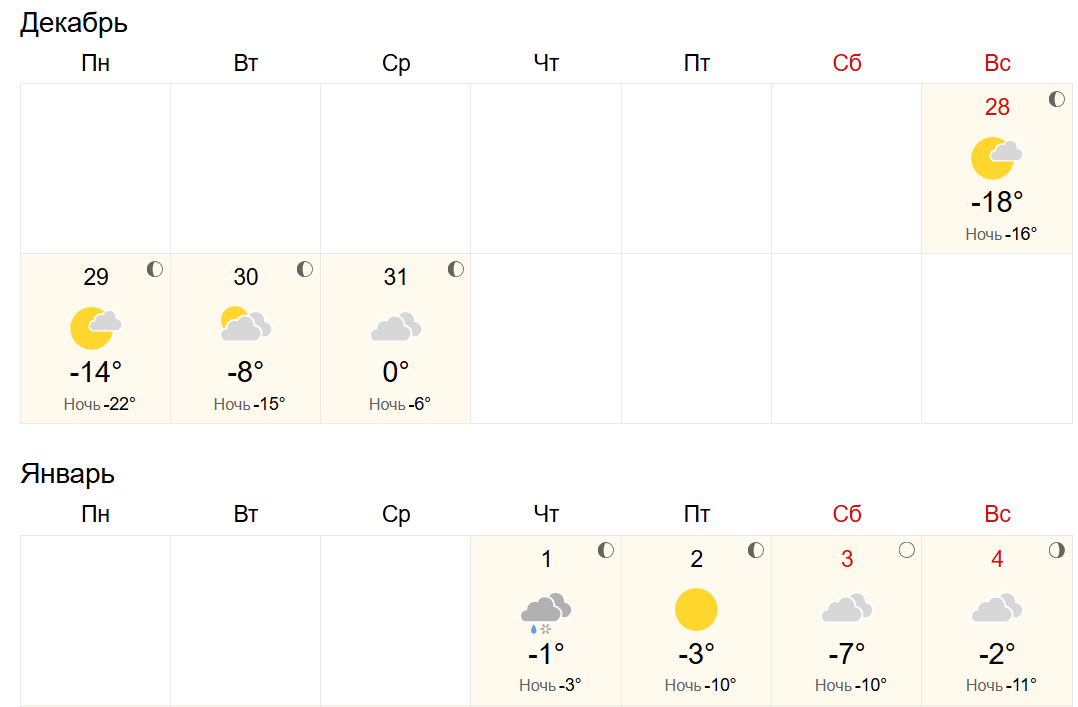 World Weather прогнозирует ночные температуры от -22 до -3 градусов. Наибольшее потепление, до 0 градусов, ожидается 31 декабря. Самым холодным днем недели станет 29 декабря с дневной температурой около -14 градусов.