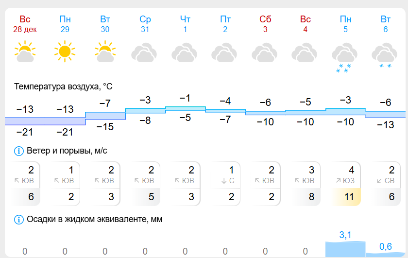 Прогноз от «Яндекс.Погоды» указывает, что понедельник, 29 декабря, будет самым холодным днем с дневной температурой около -10 градусов. Во вторник потеплеет до -5 градусов. В новогоднюю ночь термометры покажут примерно -3 градуса. 1 и 2 января днем ожидается -1…-2 градуса. Погода будет облачной с осадками в виде снега и мокрого снега. К выходным температура снизится до -3…-6 градусов.