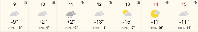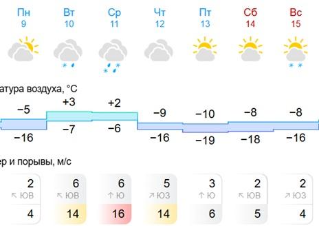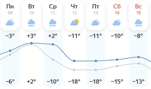 «Яндекс Погода» сообщает о пасмурной неделе. После начала с -3°C температура вырастет до +2…+3°C, причем в ночь на 10 февраля ожидается +2°C. С 12 февраля морозы вернутся: 12-13 февраля днем будет -11°C, ночью до -18°C. В выходные станет немного теплее: днем -8…-10°C, ночью -13…-15°C. Осадки в начале недели — снег с дождем, затем только снег.
