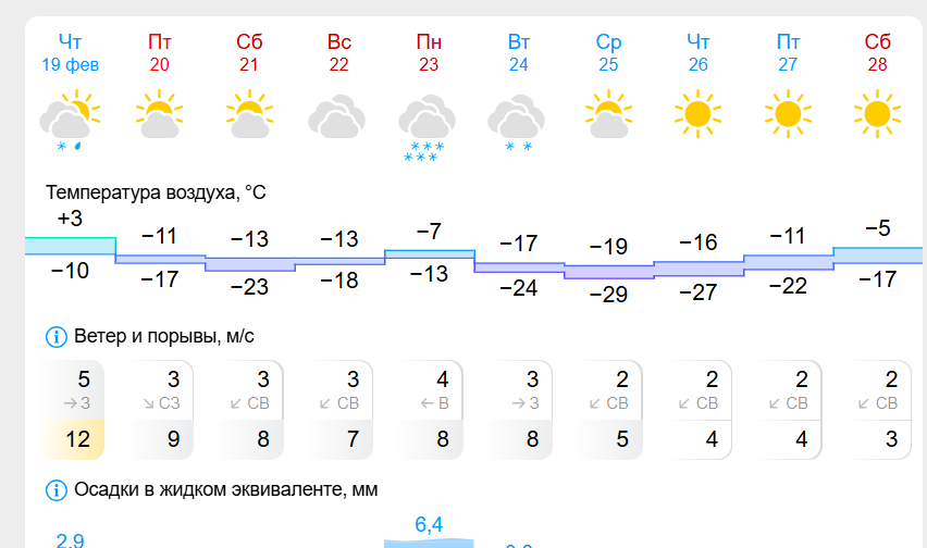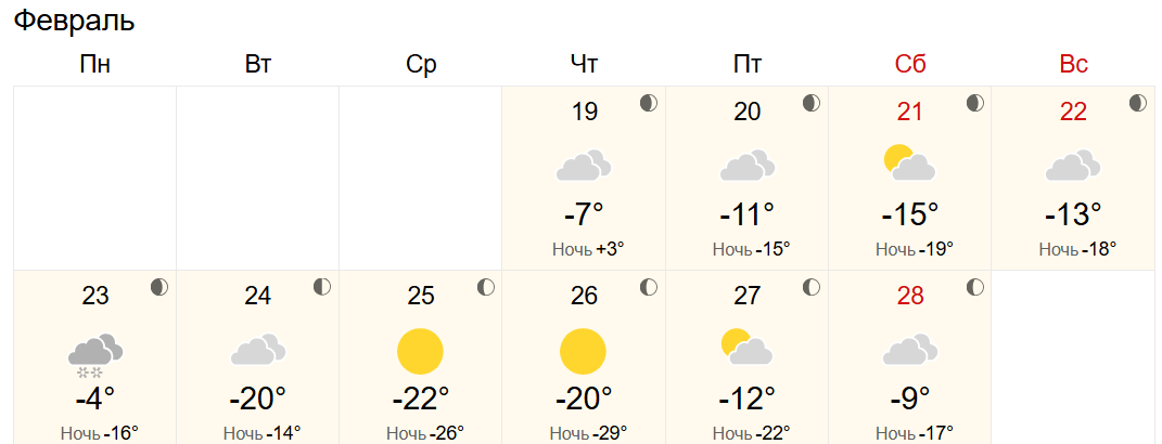 Прогноз «Яндекс.Погоды» также указывает на похолодание. В субботу, 21 февраля, днём ожидается -14 °C, а в воскресенье — -13 °C. Понедельник, 23 февраля, может стать немного теплее, до -11 °C, однако небо будет затянуто облаками, и возможен лёгкий снег. Ночные температуры на протяжении всех выходных, по этим данным, будут колебаться в интервале от -16 °C до -19 °C.