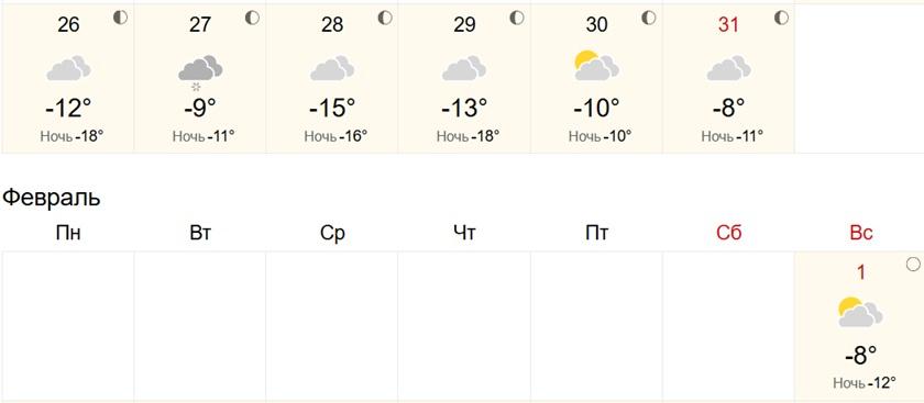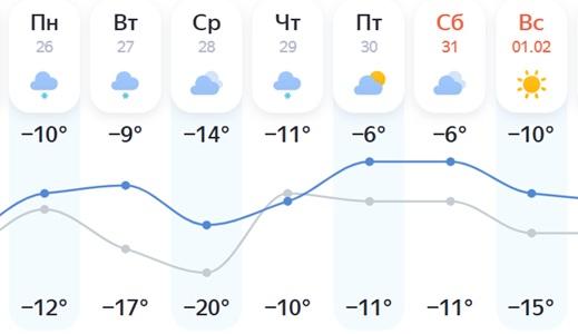 По данным Gismeteo, в понедельник, 26 января, дневная температура составит около -11 градусов. Во вторник похолодает до -14 градусов, после чего начнется потепление. К концу недели воздух прогреется до -9…-6 градусов днем. Ночью морозы не опустятся ниже -22 градусов, а на выходных ночная температура будет держаться на уровне -13…-12 градусов.