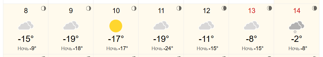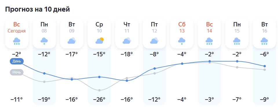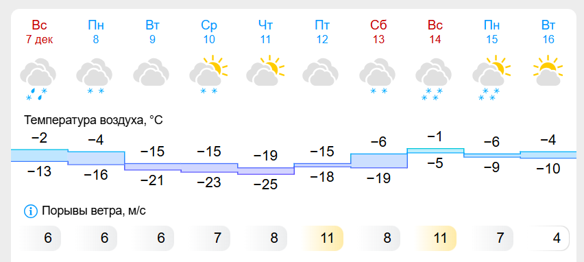 Прогноз Яндекс.Погоды сулит похолодание уже в понедельник, 8 декабря, до -12°C. Во вторник температура опустится до -17°C. Самый морозный день, как и в других прогнозах, — четверг, 11 декабря. С него установится облачная, но сухая погода без осадков. К субботе и воскресенью вновь наступит потепление до -2...-4°C.
